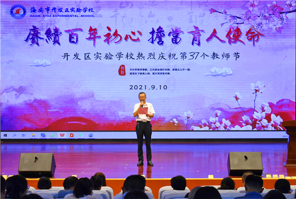 王校长首先代表全校的老师发表题为“赓续百年初心 担当育人使命”的演讲。王校长回顾了开实七年来的艰辛与辉煌,同时他也提出了几点希望。他要求全体教师要不辱使命,加快学校教育的发展;要以身作则,做为人师表的楷模;要开拓创新,提升学校的教学质量;奋勇争先,做人民满意的教师,会场的掌声献给勇于担当的全体老师。