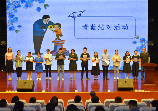 我们正青春,奋斗正当时,接下来庆祝活动进行的是青蓝工程结对仪式,一共六组师徒接过小学部缪吉丽校长,初中部的吕广军校长手上的青蓝合同,从此美美与共,从此强势走高。