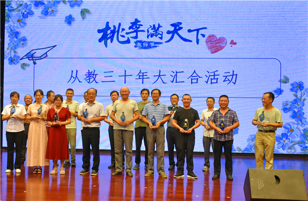 当从教三十年的老教师出现在舞台中央,会场再次响起热烈的掌声,他们手上拿着学校颁发的从教三十年纪念奖杯,脸上洋溢着灿烂的笑容。三尺讲台,四季耕耘,沧桑岁月,几度芳华。这群老黄牛在教书育人的道路上默默走过了三十年的风风雨雨,执着坚守在平凡的岗位上,把成长给了学生,把成才给了学生,把成功给了学生。